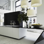 Para esta cocina moderna y elegante diseñada por nuestro equipo de Davinia, especialistas en cocinas de lujo, hemos seleccionado mobiliario en laca de color negro mate combinada con madera natural en roble.Para la encimera se ha elegido un material porcelánico también en negro mate, forrando las paredes en el mismo acabado para evitar azulejos, ya que la cocina se encuentra situada en el mismo espacio que el salón de la vivienda. Por este mismo motivo, y con el fin de evitar que se vea, la campana extractora se ha integrado en los muebles.El fregadero está fabricado en el mismo material que la encimera para que pase desapercibido, al igual