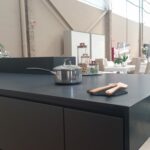 Para esta cocina moderna y elegante diseñada por nuestro equipo de Davinia, especialistas en cocinas de lujo, hemos seleccionado mobiliario en laca de color negro mate combinada con madera natural en roble.Para la encimera se ha elegido un material porcelánico también en negro mate, forrando las paredes en el mismo acabado para evitar azulejos, ya que la cocina se encuentra situada en el mismo espacio que el salón de la vivienda. Por este mismo motivo, y con el fin de evitar que se vea, la campana extractora se ha integrado en los muebles.El fregadero está fabricado en el mismo material que la encimera para que pase desapercibido, al igual