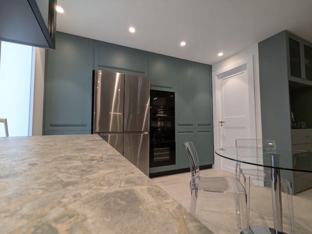 El diseño de esta cocina con mobiliario en verde está planteado en diferentes ambientes para aprovechar al máximo el espacio disponible.