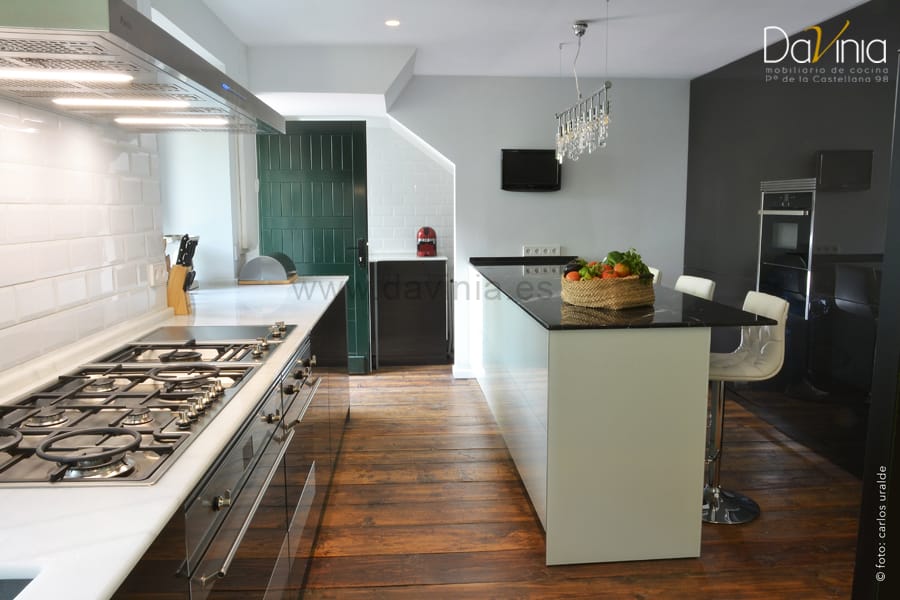 El diseño de esta cocina a medida instalada por Davinia estuvo muy condicionado por la elección de los materiales. Para el mobiliario se escogió puertas de cristal efecto listo y espejo. En concreto, se combinó puertas de cristal blanco en la península y la zona del frigorífico, con puertas en cristal antracita para el resto del mobiliario. De la misma forma, se combinó una encimera en mármol negro Marquina, con encimera en mármol blanco Macael.