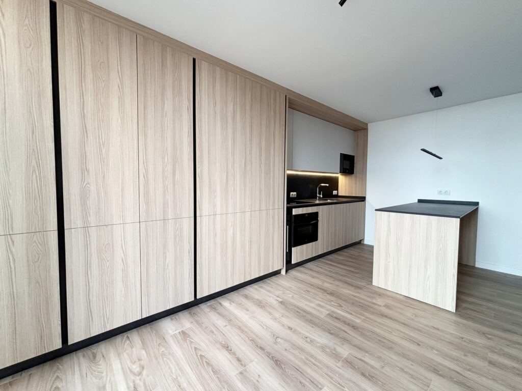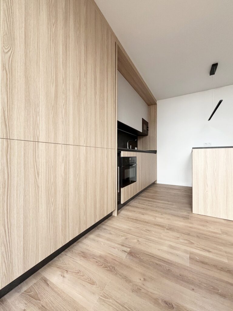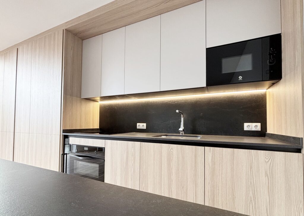 La cocina se organiza mediante una distribución en línea, una solución especialmente adecuada para apartamentos compactos y espacios abiertos. Esta disposición permite concentrar todas las funciones en un único frente de trabajo, facilitando la circulación y manteniendo el ambiente despejado.