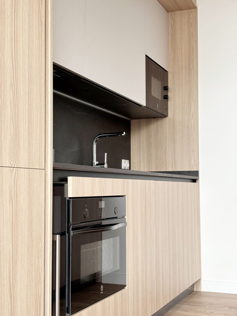 La combinación de frentes en madera clara, muebles altos en tonos suaves y encimera oscura genera un equilibrio muy agradable entre calidez y sobriedad. El sistema de apertura mediante gola negra integrada refuerza la limpieza de líneas del diseño.