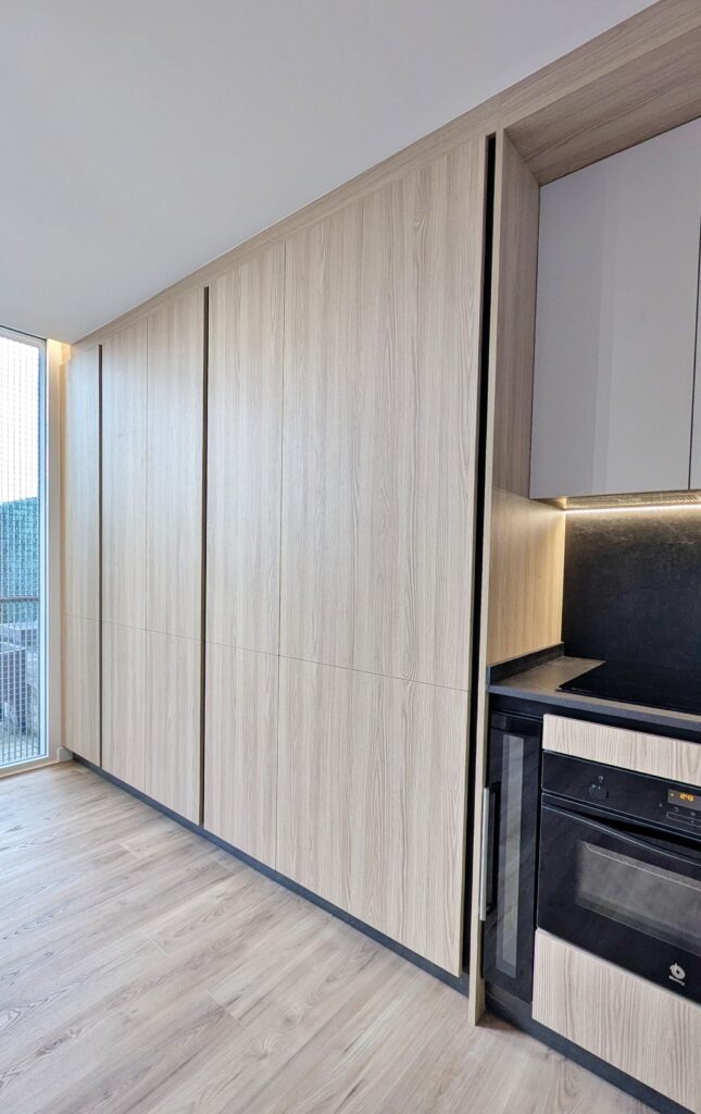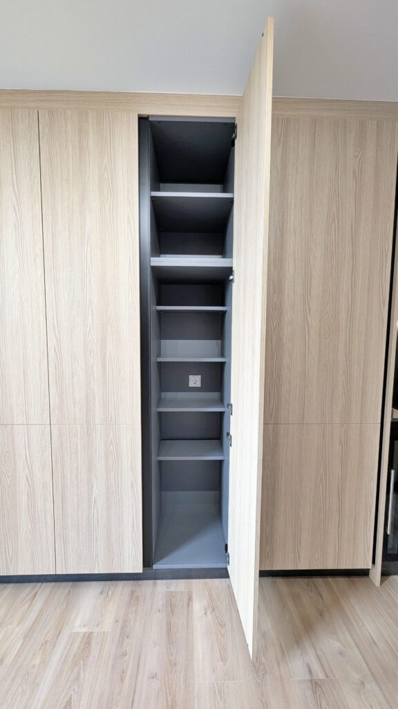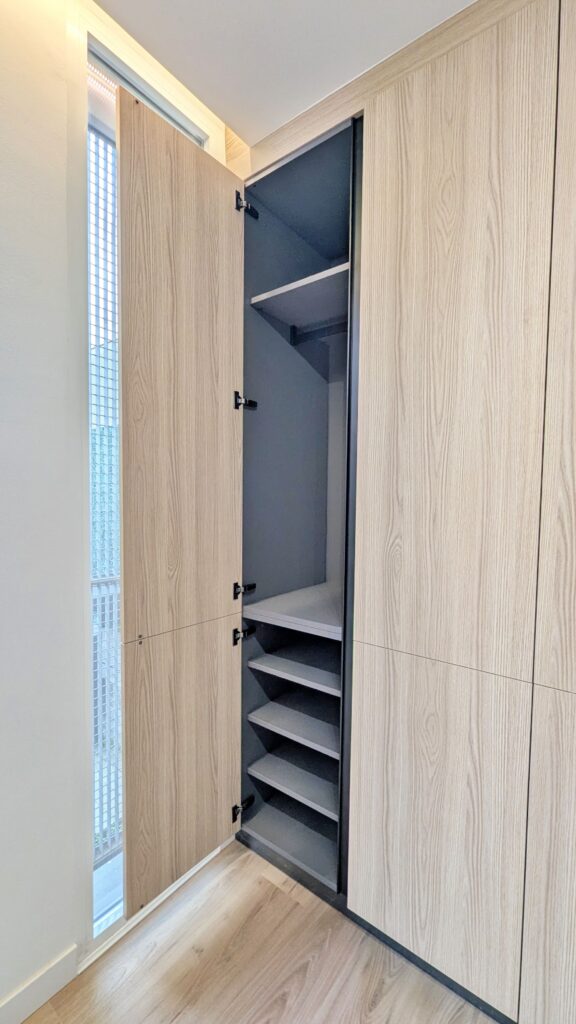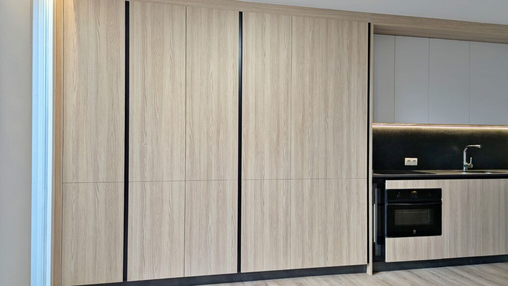 Uno de los aspectos más interesantes del proyecto es la incorporación de una larga línea de armarios que recorre toda la pared, diseñada para cubrir distintas necesidades del apartamento.
