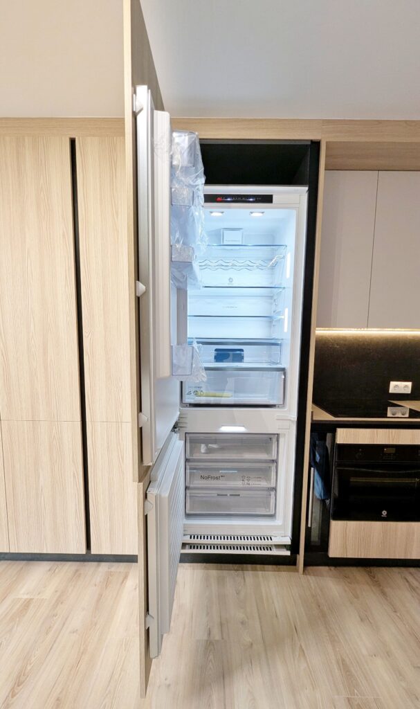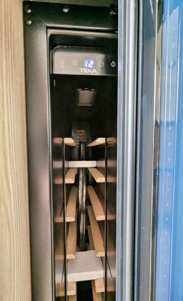 En este frente se integran el horno, la placa de inducción, el fregadero, la vinoteca y los electrodomésticos panelados, acompañados por una zona de mobiliario alto que amplía la capacidad de almacenamiento sin sobrecargar visualmente el espacio. Los electrodomésticos, de la firma Balay, se integran discretamente en el conjunto, reforzando la continuidad estética del diseño.