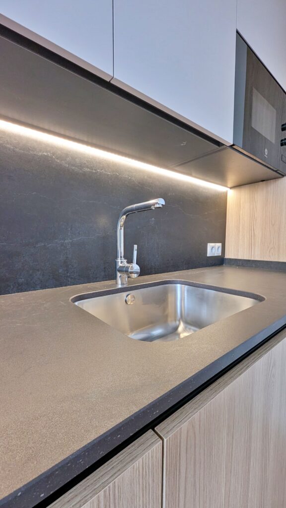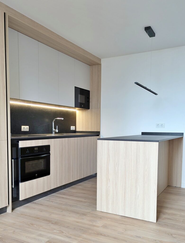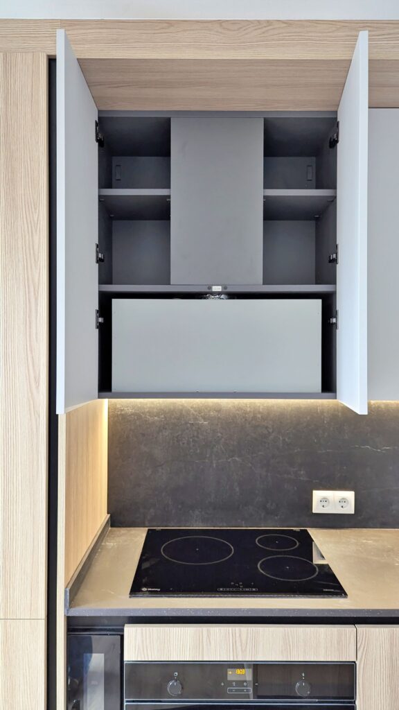 En este proyecto recientemente finalizado en Madrid, el principal reto consistía en diseñar una cocina funcional dentro de un apartamento de dimensiones reducidas y distribución completamente abierta. En este tipo de viviendas, donde cocina, salón y dormitorio comparten un mismo espacio, cada decisión de diseño debe contribuir a mantener el orden visual y a aprovechar al máximo la superficie disponible.