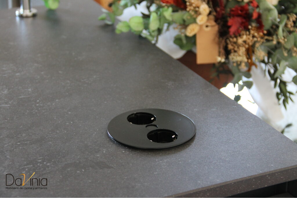 Para la encimera se ha optado por seguir la misma línea de color que en el mobiliario, escogiendo el modelo Dekton Fossil, compuesta con una mezcla de minerales, muy resistente y versátil.