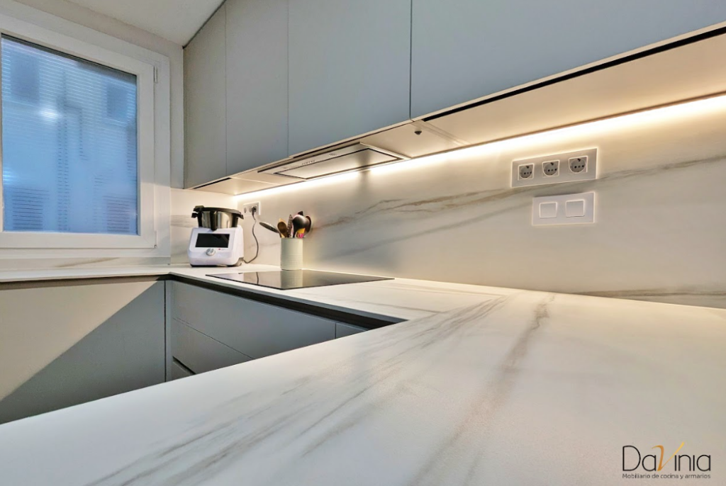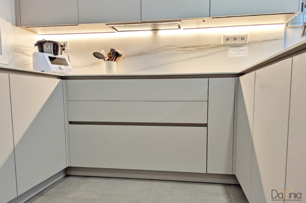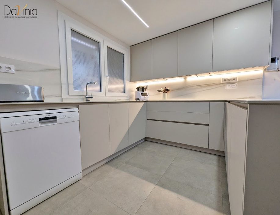 Proyecto de reforma integral orientado a crear una cocina luminosa, funcional y equilibrada. La distribución en U y la península permiten organizar correctamente las zonas de trabajo, mientras que el mobiliario en tonos claros y acabado mate aporta amplitud visual. La encimera Laminam Bianco Anayet refuerza la elegancia del conjunto y la iluminación integrada contribuye a un espacio práctico, cómodo y bien resuelto para el uso diario.