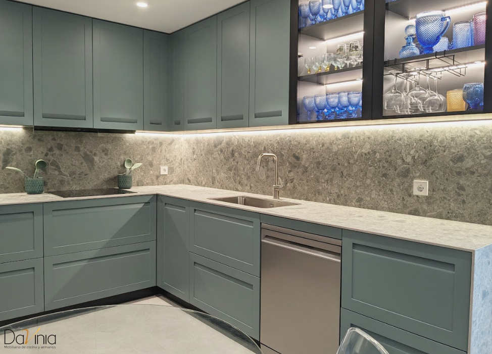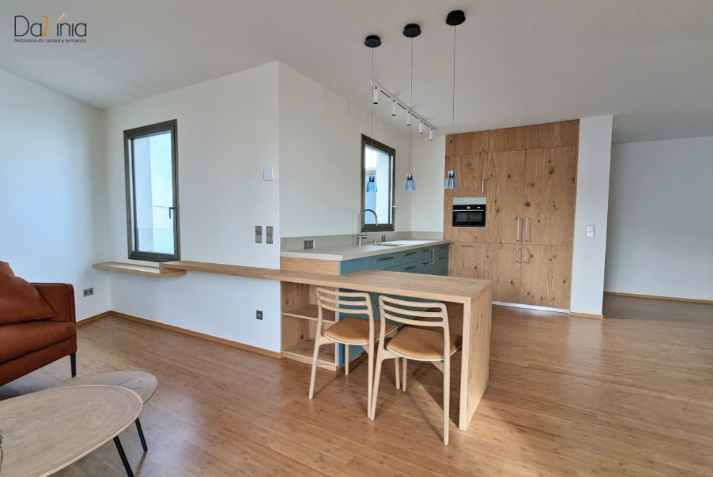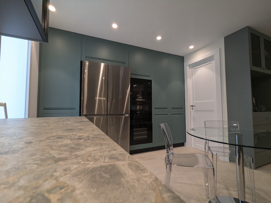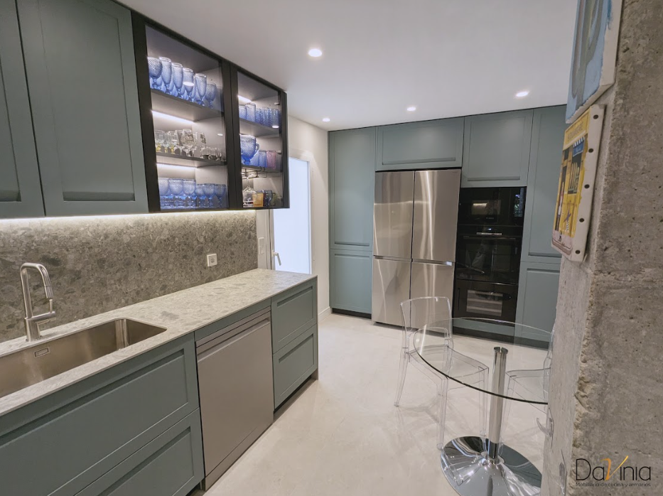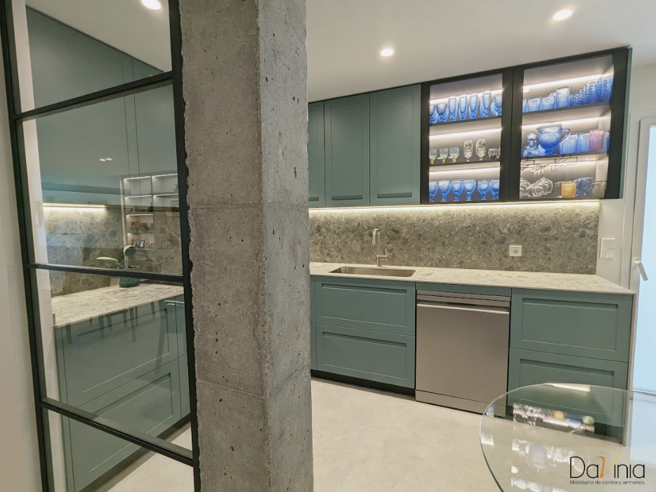 Este proyecto destaca por la integración de mobiliario en verde que dota de carácter y calidez a varios ambientes de la vivienda, incluyendo la cocina. La elección de este color, combinada con acabados en madera y superficies neutras, logra un espacio equilibrado y con personalidad. La distribución funcional en L permite una circulación cómoda entre las distintas zonas de trabajo, mientras que los contrastes cromáticos aportan dinamismo sin perder sobriedad, resultando en una cocina elegante y perfectamente adaptada al estilo de vida de sus propietarios.