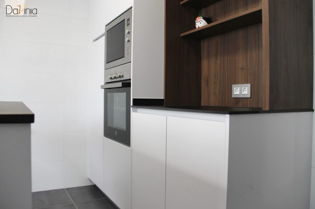 Cocina diseñada a medida en una combinación de blanco, negro y madera, que conjuga modernidad y calidez. La distribución prioriza la practicidad con electrodomésticos integrados y amplias zonas de almacenaje, mientras que la paleta cromática aporta contraste sin perder sobriedad. Los acabados en madera natural introducen una nota cálida que equilibra las superficies blancas y negras, generando un conjunto armónico y elegante, ideal para un uso cotidiano sin renunciar a su estilo moderno.